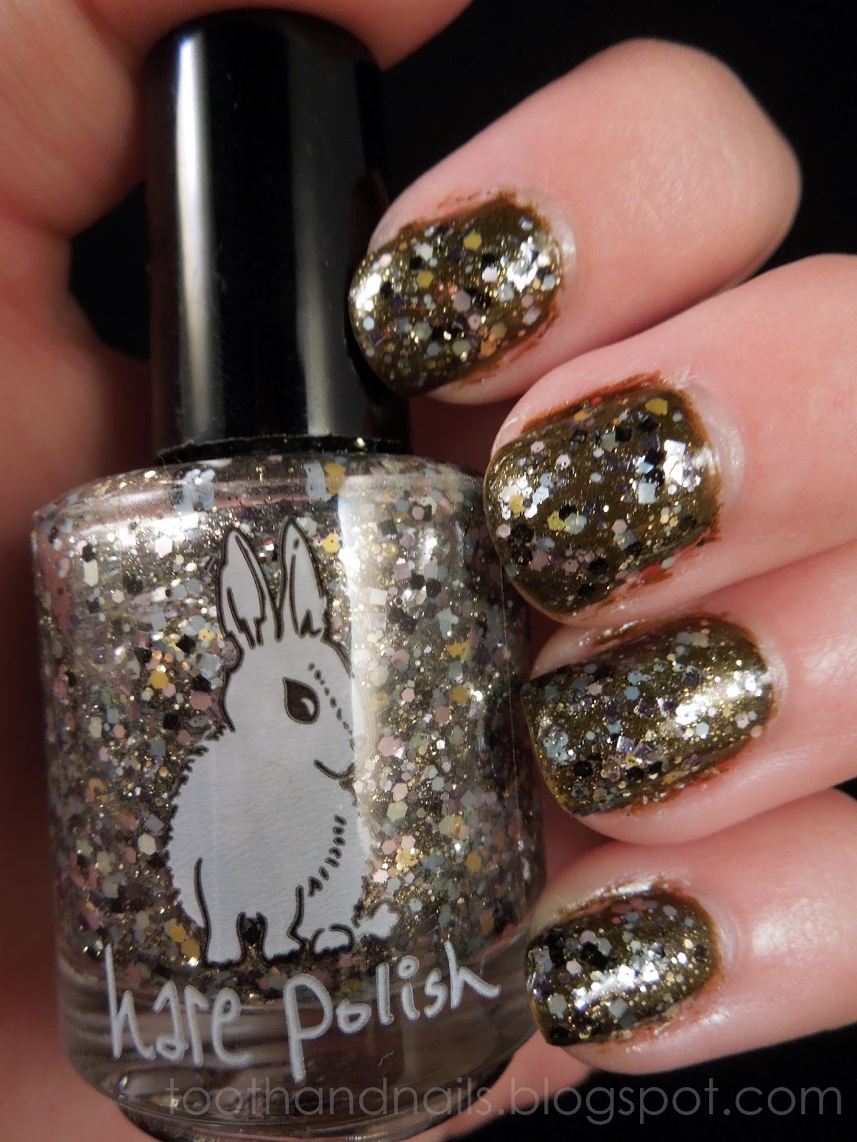 Rainbow Bridge is a gorgeous, dense multi colored glitter in a clear base. There are all kinds of shapes - hexes, circles, even stars. But not only is this polish fabulous, it's for a very good cause. This polish (and another called Browny Bear) were made in memory of the creator's dog, Browny, who passed away unexpectedly from cancer. All proceeds from those two polishes go to the National Canine Cancer Foundation. As a staunch animal lover (and a dog owner myself), I can definitely get behind that cause.